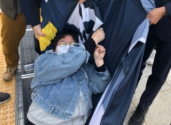 차별금지법제정연대(차제연) 활동가들이 차별금지법 제정을 미루는 국회를 규탄하며 국회 본청 앞에서 기습 시위를 벌였다. 차제연의 지오 활동가와 이...