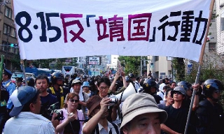 일본에서는 2차 대전 패전일인 15일, 정부 관료 3인과 100여 명의 의원들이 집단으로 야스쿠니 신사를 참배한 가운데 “야스쿠니도, 아베의 개...