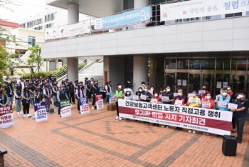 고객센터 직영화를 요구하며 전면 파업에 나선 건보공단 고객센터 노동자들이 갑작스레 단식을 시작한 김용익 건보공단 이사장을 규탄하고 나섰다. 김 ...