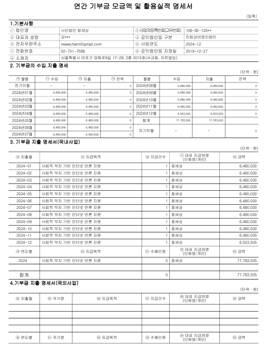 2024년도 기부금 모금액 및 활용실적 명세서