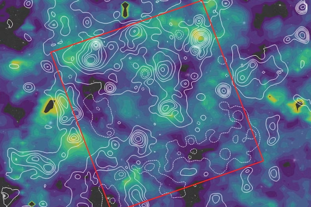 새로운 물질 지도는 은하(색상)와 암흑물질(흰색 등고선)을 서로 연결한다출처디아나 스코냐밀리오(Diana Scognamiglio) 저자 제공.