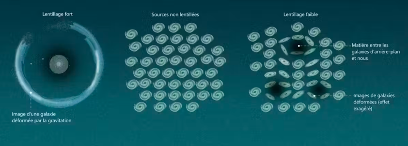 제임스 웹 우주망원경(James Webb Space Telescope)이 촬영한 다수의 영상을 분석해 우리는 중력렌즈 효과를 검출한다우리와 해당 은하 사이에 있는 거대 질량 천체가 배경 은하의 영상을 매우 미세하게 왜곡한다출처유럽우주국(ESA, 유럽우주국과 계약을 맺은 ATG의 기여), CC BY-SA