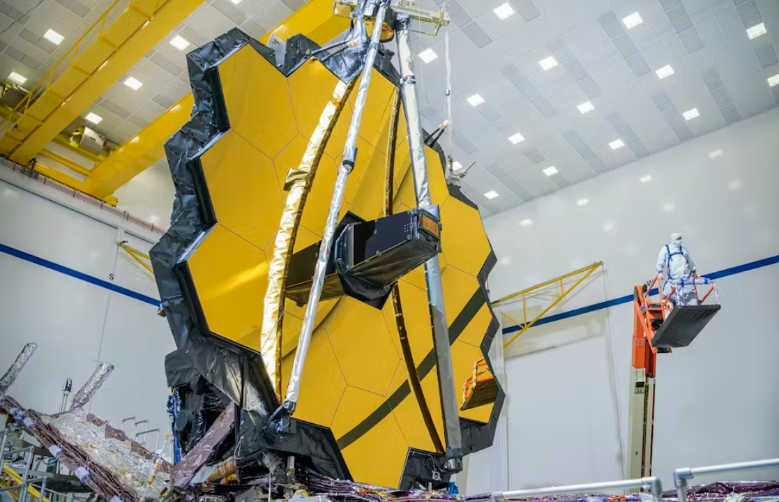 2020년 발사에 앞서 시험 과정에서 촬영한 제임스 웹 우주망원경(James Webb Space Telescope)의 지름 6.5미터 주경이다거울이 매우 커서 로켓에 탑재하려고 접은 뒤 우주에서 다시 펼쳤다출처NASA/Chris Gunn