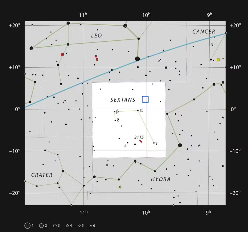 육분의자리(Sextantus)에 위치한 코스모스(COSMOS) 관측 영역이다출처유럽남방천문대(ESO)국제천문연맹(IAU), Sky & Telescope, CC BY