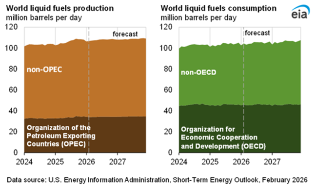 이 두 요인이 현실화하면 배럴당 유가는 세 자릿수로 올라갈 수 있다. 그러나 세계 경제 성장의 상대적 둔화와 재생에너지로의 전환 확대 때문에 전 세계 석유 생산과 공급은 전 세계 수요를 충분히 웃돌고 있다는 점을 기억해야 한다. 지난해 추정에 따르면 2025년 전 세계 액체 연료 소비는 하루 110만 배럴 증가했고, 올해는 하루 120만 배럴 증가할 가능성이 있다. 그러나 세계 석유 생산 증가 속도는 석유 소비 증가 속도를 계속 앞지를 것이며, 그 결과 2026년에는 석유 재고가 하루 310만 배럴 늘어날 것이다.