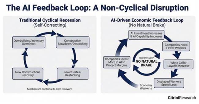 AI 투자 증가&AI 능력 향상->기업은 더 적은 노동자를 필요로 함->화이트칼라 해고 증가->일자리를 잃은 노동자들의 소비 감소, 경제 약화->기업은 이윤 방어를 위해 AI 투자 확대