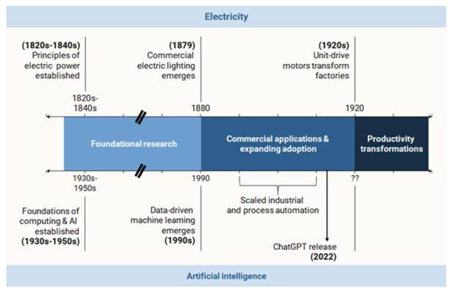 OECD는 AI가 범용 기술로 자리 잡기까지 최대 20년이 걸릴 수 있다고 본다이는 AI 모델과 에이전트가 충분한 경험을 축적하고 인간만큼 오류가 적은 수준에 도달한다는 가정을 전제로 한다또 다른 보고서는 1830년대 마이클 패러데이(Michael Faraday)와 조지프 헨리(Joseph Henry)가 전류를 생성한 이후 전기가 생산성 향상과 경제 구조 변화를 이끄는 데 약 100년이 걸렸다고 지적한다챗지피티(ChatGPT)는 불과 5년 전에 등장했을 뿐이다.