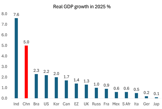 이러한 판단에는 충분한 근거가 있다. 2025년 중국의 실질 GDP 성장률은 5%였다이 수치는 세계 주요 경제 가운데 인도만이 더 높은 수준을 기록했는데(인도는 GDP 통계를 과장한다는 지적을 받는다), 미국 성장률의 두 배 이상그리고 나머지 주요 G7 자본주의 국가들의 약 세 배에 해당하는 수준이다.
