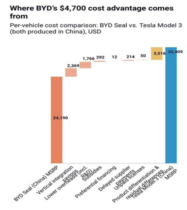 <BYD의 4,700달러 비용 우위는 어디에서 오는가차량 1대당 비용 비교: BYD Seal vs. 테슬라 Model 3>