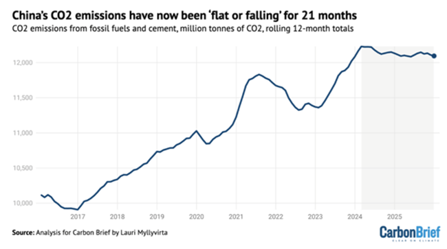 녹색 발전 역시 여전히 중요하다. 2025년 마지막 분기에 중국의 이산화탄소 배출량은 15% 감소했으며그 결과 연간 기준으로 약 0.3% 감소했을 가능성이 크다이러한 흐름은 2024년 3월에 시작된 중국 CO₂ 배출의 정체 또는 감소’ 추세를 이어 가는 것이다이 추세는 이제 거의 2년 동안 지속되고 있다.