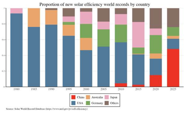 중국의 태양광 산업은 지난 40년 동안 중국 경제 부상의 대표적 사례였다중국의 태양광 생산은 2004년부터 2013년까지 연평균 76% 성장했다동시에 태양광 비용은 90% 이상 하락하여 화석연료와 경쟁할 수 있는 수준이 되었다생산·설치·연구개발을 지원하는 보조금은 중국 태양광 산업이 폭발적으로 성장한 주요 원인이었다지난해는 에너지 저장 능력(주로 배터리)이 2025년 중국의 최대 전력 수요 증가 속도보다 더 빠르게 성장한 첫 해였다또한 지난 10년 평균 증가율보다도 더 빠르게 증가했다.