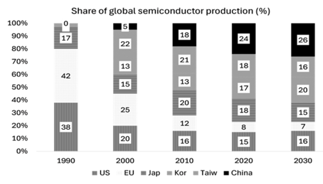 중국은 산업용 로봇 밀도에서도 미국을 앞선다. 2023년 기준 중국은 노동자 1만 명당 470대의 로봇이 설치되어 있었으며미국은 295대였다또한 중국의 특허 점유율은 2000년 4%에서 2023년 26%로 상승해 곧 미국과 맞먹는 수준에 도달할 전망이다같은 기간 미국의 점유율은 8%포인트 이상 감소했다그리고 중국의 반도체 생산은 현재 세계 생산의 약 4분의 1을 차지하며이는 미국의 16%, 유럽의 7%와 비교되는 수준이다.