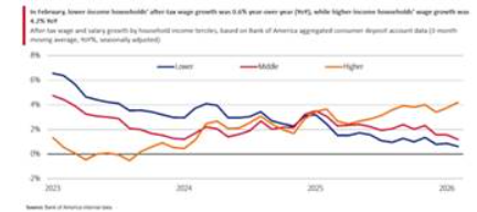 전쟁의 영향은 미국 내 부유한 엘리트와 일반 가계 사이의 격차를 더욱 확대하고 있으며주류 경제학자들은 이를 ‘K자형 경제라고 부른다소득 상위 계층에서는 지출 증가 속도가 두드러지게 빠른 반면팬데믹 이후 잠시 높은 임금 상승을 경험했던 하위 계층 소비자들은 이제 임금 상승세가 둔화하는 상황을 맞고 있다.