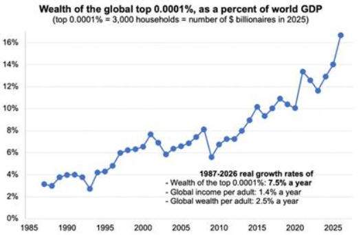 전 세계 상위 0.0001%의 부세계 GDP 대비 비율(상위 0.0001% = 약 3,000가구 = 2025년 기준 억만장자 수)/ 1987~2026년 실질 성장률(상위 0.0001%의 부연 7.5%, 성인 1인당 세계 소득연 1.4%, 성인 1인당 세계 자산연 2.5%)