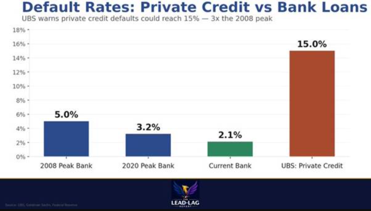 부도율프라이빗 크레딧 vs 은행 대출, UBS는 프라이빗 크레딧 부도율이 15%에 이를 수 있다고 경고 — 2008년 정점의 3