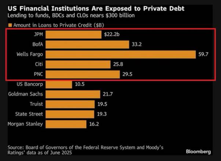 게다가 프라이빗 크레딧과 상업은행은 밀접하게 연결되어 있다에르난데스 데 코스는 은행은 비은행 기관에 대해 대출자이자 거래상대방이며 서비스 제공자이고 때로는 최후의 안전망 역할을 한다고 지적하며규제 당국의 통제를 벗어난 레버리지유동성 전환만기 위험이 얽힌 복잡한 생태계를 우려했다이는 프라이빗 크레딧이 시스템 리스크의 경로가 될 수 있음을 의미한다미국 은행들은 약 3,000억 달러 규모의 프라이빗 크레딧 익스포저를 보유하고 있으며웰스파고(Wells Fargo)는 600억 달러로 가장 크고최근 소프트웨어 관련 대출을 평가절하하고 대출을 축소한 JP모건은 220억 달러의 위험 노출을 갖고 있다.