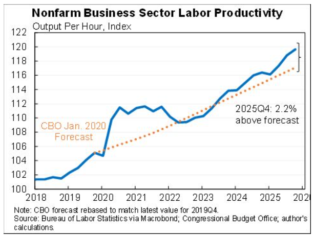 노동생산성은 실질 GDP를 노동시간으로 나눈 값으로기술 변화나 노동자 1인당 자본량 변화에 따라 달라진다주류 경제학자들은 또한 총요소생산성(TFP)을 살펴보는데이는 자본 투자 증가나 노동 투입 확대만으로 설명되지 않는 생산성 증가를 의미하며이 지표도 상승하고 있다.