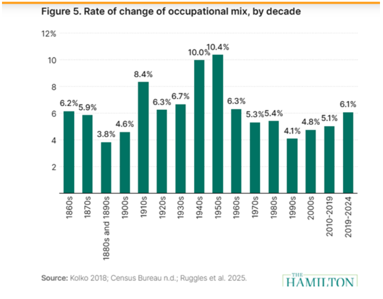 미국 인구조사국(Census Bureau)의 기업 동향 및 전망 조사에 따르면 AI를 어떤 형태로든 활용하는 기업은 5분의 1에도 못 미치며상품과 서비스 생산에 직접 활용하는 기업은 그보다 더 적다실제로 현재까지 AI로 인한 전환기적 충격은 최근 기술 변화 속도를 앞지르지 못하고 있다.” 지난 3년간 직업 구성 변화 속도는 상업용 컴퓨터 시대(1984)와 인터넷 상업화 시대(1996이후와 비슷한 수준이며챗지피티 출시 이후에도 가속화하지 않았다.