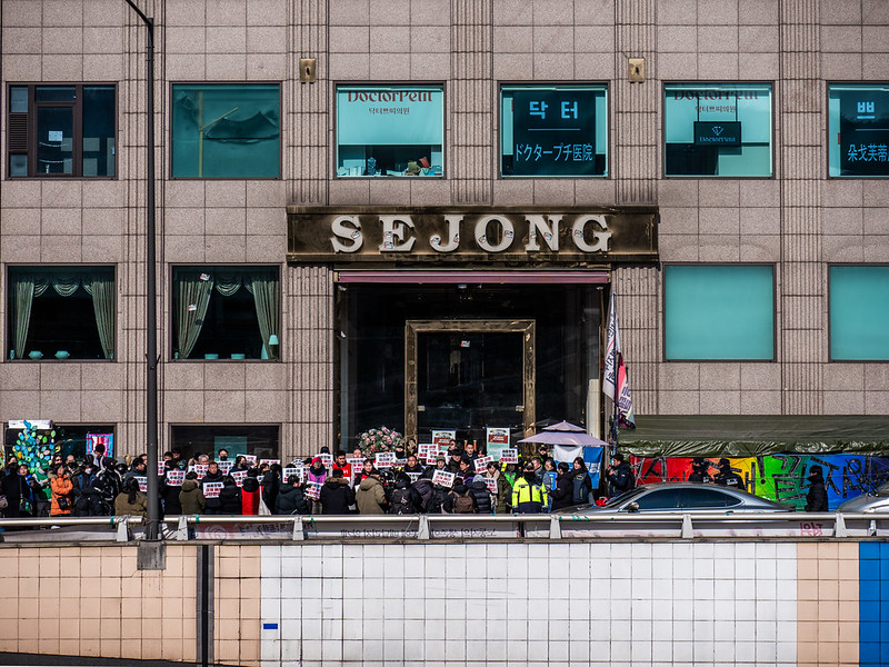 세종호텔 공대위가 경찰과 사측의 농성장 침탈에 항의하고 연행자들의 석방을 촉구하는 긴급 기자회견을 호텔 앞에서 개최했다. 이날 오전 경찰은 해고자들의 복직과 실소유주 주명건의 교섭 참여 등을 요구하던 로비 농성장을 침탈하고, 민주노총 서비스연맹관광레저산업노조 세종호텔지부 조합원들과 연대...